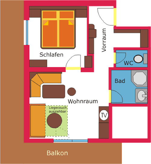 Wir bieten Ihnen gemütliche Wohnstudios alle ausgestattet mit:Dusche / WC * Kühlschrank * Kabel-TV * gemütlicher Wohnraum * Balkon.